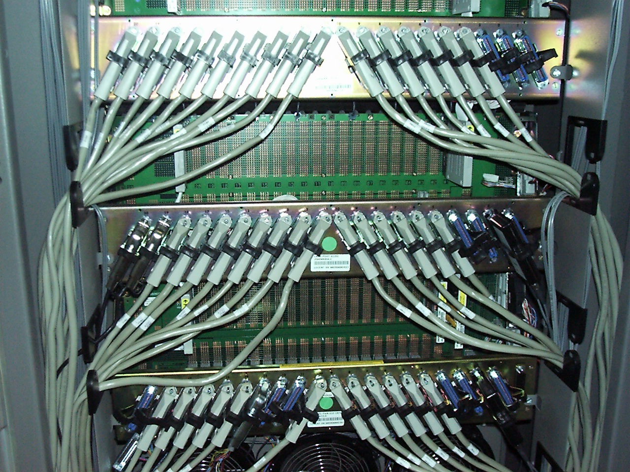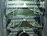 multicarrier cabinet shown from the rear. Each plug connects trunks,